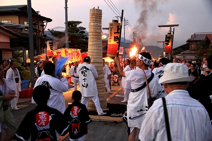 稀にみる台風の中行われた昨年の「火祭り」では、散々な思いをされたご参拝の方もいらっしゃったのではないかと想像します。 しかしながら、語り草となるほどの大雨の中でも例年と変わらず、勇壮に神輿を担ぎ、大松明を焚き上げるべく奮闘し、雨にも負けずご参集くださった人々の熱気がありました。 火と水の関係、自然の恵みについて思いをいたしつつ、神の威を感得すべく期を待つ人々の想いを感じずにはいられない素晴らしいお祭りだったといえます。 どのような天候であれ、お越し下さった方々が御神威を感じて頂けるようなお祭りを、氏子中を挙げ町を挙げ、守り伝えて行く所存でございます。 本年も、また今後も、どうぞお参り頂けますようお待ち申し上げております。